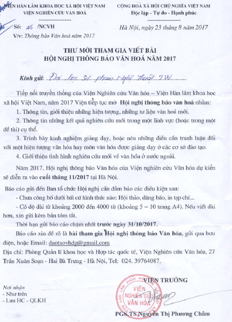 Thư mời tham gia viết bài hội nghị thông báo văn hóa năm 2017