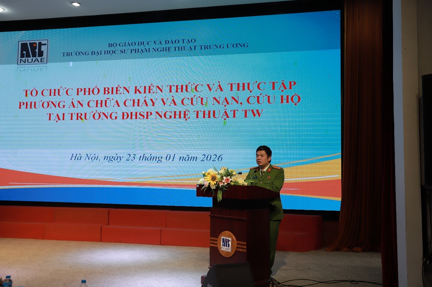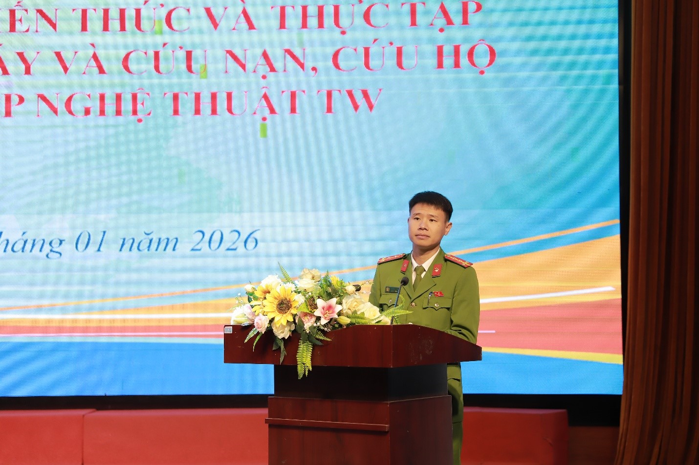 Sáng ngày 23/01/2026, Trường ĐHSP Nghệ thuật TW đã phối hợp với Đội Chữa cháy và Cứu nạn cứu hộ (CC&CNCH) khu vực 31, Phòng Cảnh sát PCCC&CNCH – Công an Thành phố Hà Nội tổ chức phổ biến kiến thức và thực tập phương án CC&CNCH. Chương trình nhằm nâng cao nhận thức, kỹ năng xử lý tình huống khẩn cấp cho cán bộ, viên chức, người lao động, học viên và sinh viên trong Nhà trường, đảm bảo an toàn phòng cháy chữa cháy PCCC theo đúng quy định của pháp luật.
