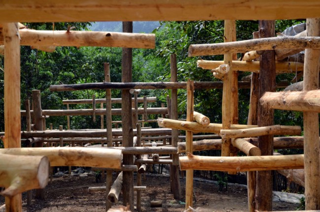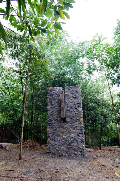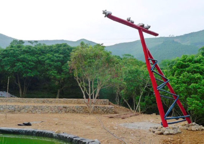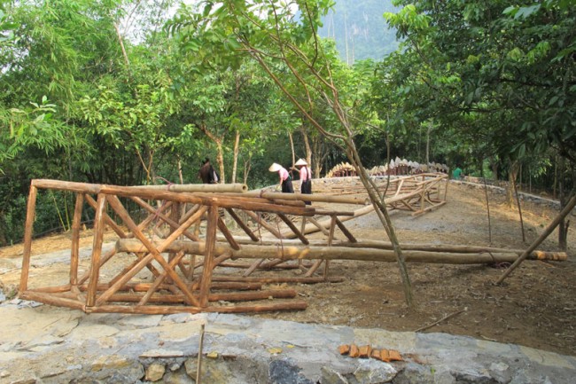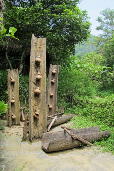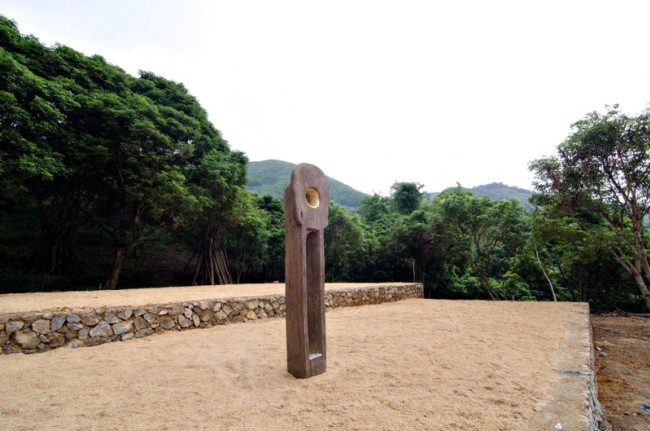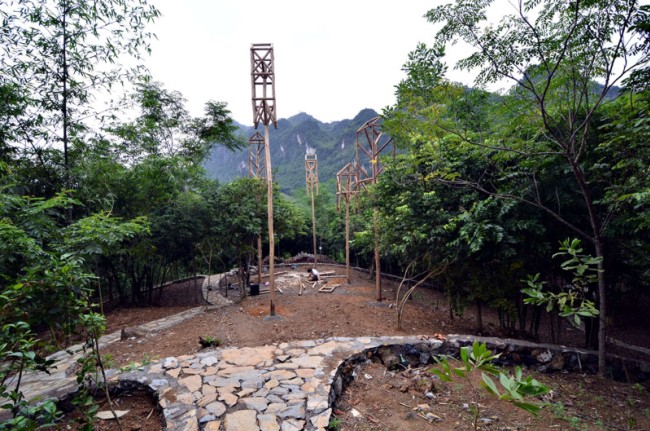 Điểm nhấn cho không gian của thử nghiệm này có lẽ là tác phẩm “Cây đất Mường” của Nguyễn Ngọc Lâm và “Thời gian đi qua” của Nguyễn Huy Tính. Không hẹn mà gặp, cả hai họa sĩ này đều sáng tác bắt nguồn từ cảm hứng về nhà sàn của người miền núi, tạo nên sự phối hợp giữa một tác phẩm trải dài trên triền đồi, tác phẩm còn lại thì vút cao lên bầu trời trên vùng đồi xanh mướt của rừng trúc. Nguyễn Huy Tính ngậm ngùi với tác phẩm “Thời gian đi qua” bằng chất liệu gỗ, đinh sắt. Những cây gỗ được gắn với nhau theo chiều ngang, dọc, lặp đi lặp lại tạo sự dàn trải về không gian trên triền đồi. Những đường ngang dọc khiến người xem hình dung đến nhịp điệu của cuộc sống hết đêm đến ngày, hết mùa này đến mùa khác, như tượng trưng cho những ngôi nhà sàn xa xưa theo thời gian nối tiếp bên nhau nay chỉ còn trong quá khứ. Những vật liệu dựng nhà xưa cũ nay hiếm khi còn, tất cả đã đổi thay. Người ta không dùng tranh tre nứa lá nữa mà đã thay bằng bê tông, mái ngói, mái xi – măng. Con người luôn có nhiều lựa chọn và hướng đi trong cuộc sống. Nhưng khi thời gian trôi qua, mọi sự vật chỉ còn là những kết cấu đổ vỡ, rối rắm và trơ trọi… Cao lớn, hoành tráng là ấn tượng từ tác phẩm “Cây đất Mường” của nhà điêu khắc Nguyễn Ngọc Lâm thể hiện từ chất liệu gỗ và đinh sắt. Những thân cây gỗ được ghép chiếc tổ trên đầu – một cách điệu có gợi ý từ ngôi nhà sàn. Cây là một hình tượng điêu khắc được Nguyễn Ngọc Lâm theo đuổi vài năm gần đây. “Cây đất Mường” là một tập hợp tác phẩm điêu khắc ngoài trời lấy cảm hứng từ cuộc sống miền cao, văn minh của cuộc sống miền cao, truyền thống không muốn sống dưới mặt đất mà thích sống cách khỏi mặt đất của người dân miền núi, sống trên cao đón gió mát, tránh thú dữ, nâng cao tầm nhìn. Tác phẩm của Nguyễn Ngọc Lâm được xây dựng từ hình ảnh của những cái cây cao, với những với những cành cây chặt ra để biến thành ngôi nhà cho người ở đem đến một cảm giác khác mang tính chất hai mặt của cuộc sống. Việc sử dụng cây để làm nhà ở khiến con người gần gũi với thiên nhiên, nhưng cùng đồng thời con người đã và đang phá hủy tự nhiên, khai thác tự nhiên vì những mục đích cá nhân. Thông điệp bao trùm của Nguyễn Ngọc Lâm trong loạt các tác phẩm điêu khắc này là thiên nhiên là nhà của chúng ta, hãy đưa mắt xuống dưới xem chúng ta đã xa dời mặt đất bao xa rồi, và liệu rằng chúng ta còn có một khả năng quay trở lại là con người bản chất không?