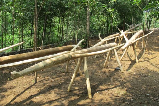 Điểm nhấn cho không gian của thử nghiệm này có lẽ là tác phẩm “Cây đất Mường” của Nguyễn Ngọc Lâm và “Thời gian đi qua” của Nguyễn Huy Tính. Không hẹn mà gặp, cả hai họa sĩ này đều sáng tác bắt nguồn từ cảm hứng về nhà sàn của người miền núi, tạo nên sự phối hợp giữa một tác phẩm trải dài trên triền đồi, tác phẩm còn lại thì vút cao lên bầu trời trên vùng đồi xanh mướt của rừng trúc. Nguyễn Huy Tính ngậm ngùi với tác phẩm “Thời gian đi qua” bằng chất liệu gỗ, đinh sắt. Những cây gỗ được gắn với nhau theo chiều ngang, dọc, lặp đi lặp lại tạo sự dàn trải về không gian trên triền đồi. Những đường ngang dọc khiến người xem hình dung đến nhịp điệu của cuộc sống hết đêm đến ngày, hết mùa này đến mùa khác, như tượng trưng cho những ngôi nhà sàn xa xưa theo thời gian nối tiếp bên nhau nay chỉ còn trong quá khứ. Những vật liệu dựng nhà xưa cũ nay hiếm khi còn, tất cả đã đổi thay. Người ta không dùng tranh tre nứa lá nữa mà đã thay bằng bê tông, mái ngói, mái xi – măng. Con người luôn có nhiều lựa chọn và hướng đi trong cuộc sống. Nhưng khi thời gian trôi qua, mọi sự vật chỉ còn là những kết cấu đổ vỡ, rối rắm và trơ trọi… Cao lớn, hoành tráng là ấn tượng từ tác phẩm “Cây đất Mường” của nhà điêu khắc Nguyễn Ngọc Lâm thể hiện từ chất liệu gỗ và đinh sắt. Những thân cây gỗ được ghép chiếc tổ trên đầu – một cách điệu có gợi ý từ ngôi nhà sàn. Cây là một hình tượng điêu khắc được Nguyễn Ngọc Lâm theo đuổi vài năm gần đây. “Cây đất Mường” là một tập hợp tác phẩm điêu khắc ngoài trời lấy cảm hứng từ cuộc sống miền cao, văn minh của cuộc sống miền cao, truyền thống không muốn sống dưới mặt đất mà thích sống cách khỏi mặt đất của người dân miền núi, sống trên cao đón gió mát, tránh thú dữ, nâng cao tầm nhìn. Tác phẩm của Nguyễn Ngọc Lâm được xây dựng từ hình ảnh của những cái cây cao, với những với những cành cây chặt ra để biến thành ngôi nhà cho người ở đem đến một cảm giác khác mang tính chất hai mặt của cuộc sống. Việc sử dụng cây để làm nhà ở khiến con người gần gũi với thiên nhiên, nhưng cùng đồng thời con người đã và đang phá hủy tự nhiên, khai thác tự nhiên vì những mục đích cá nhân. Thông điệp bao trùm của Nguyễn Ngọc Lâm trong loạt các tác phẩm điêu khắc này là thiên nhiên là nhà của chúng ta, hãy đưa mắt xuống dưới xem chúng ta đã xa dời mặt đất bao xa rồi, và liệu rằng chúng ta còn có một khả năng quay trở lại là con người bản chất không?