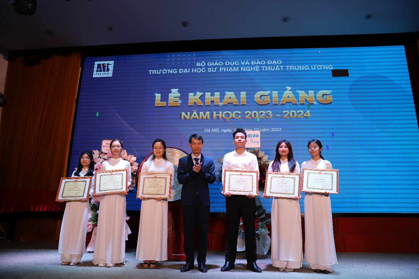 Nhằm và ghi nhận khích lệ tinh thần học tập, trong Lễ khai giảng năm học mới, Nhà trường đã trao tặng giấy khen dành cho 06 sinh viên có điểm trúng tuyển thủ khoa đầu vào năm 2023. Tân sinh viên Nguyễn Hoa Thảo Nguyên – K18B Đại học Sư phạm Âm nhạc đại diện cho tập thể sinh viên bày tỏ niềm xúc động trong ngày khai giảng đặc biệt, năm học đầu tiên tại giảng đường đại học. Sinh viên cũng thể hiện niềm tự hào của mình khi được học tập, trưởng thành tại môi trường có bề dày truyền thống, nơi đã nuôi dưỡng tài năng, chắp cánh ước mơ cho nhiều thế hệ sinh viên trưởng thành, đóng góp vào sự nghiệp giáo dục của đất nước.