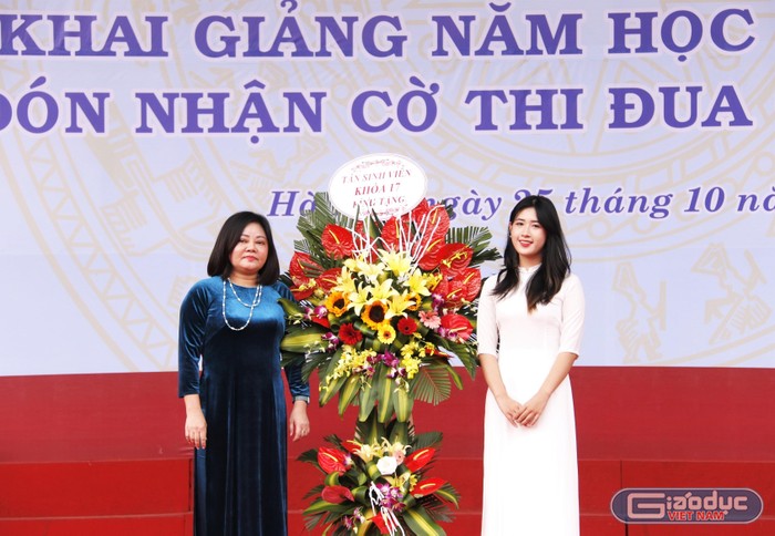 Thạc sĩ Trịnh Thị Thanh (Chủ tịch Hội đồng trường, Trường Đại học Sư phạm Nghệ thuật Trung ương) đại diện nhà trường nhận hoa chúc mừng và cảm ơn của tân sinh viên. |
