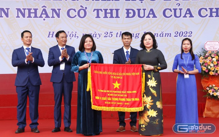Thứ trưởng Ngô Thị Minh trao Cờ thi đua của Chính phủ đến Trường Đại học Sư phạm Nghệ thuật Trung ương.