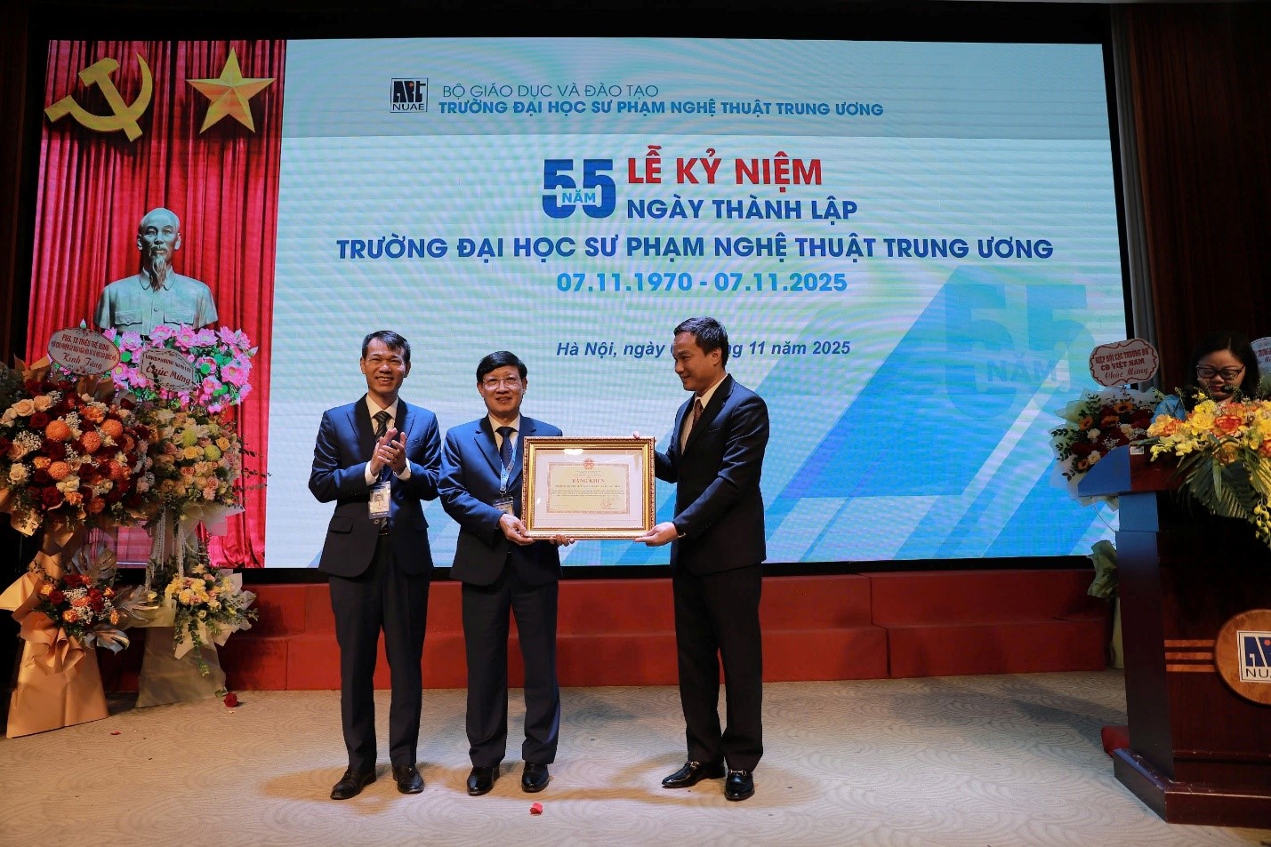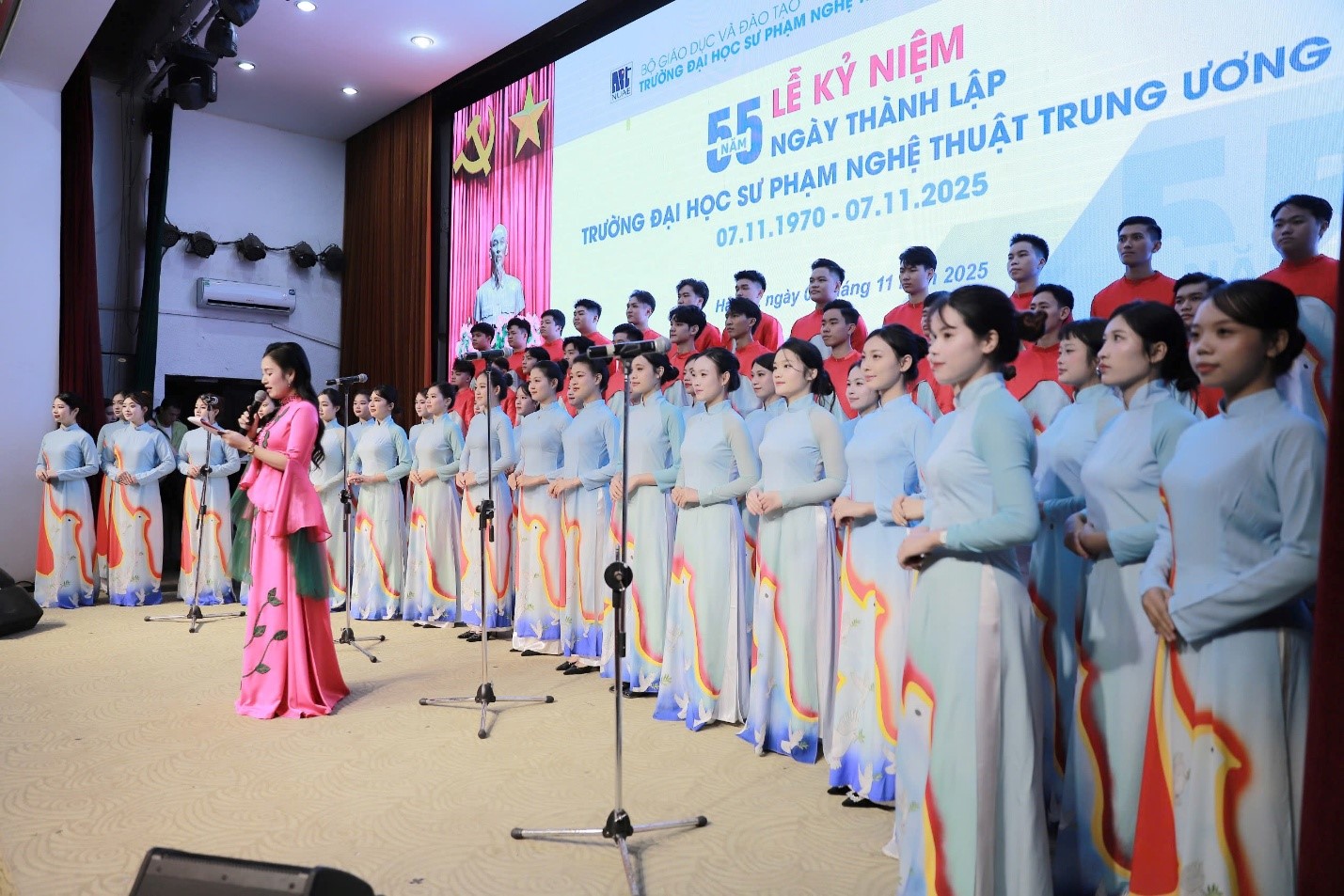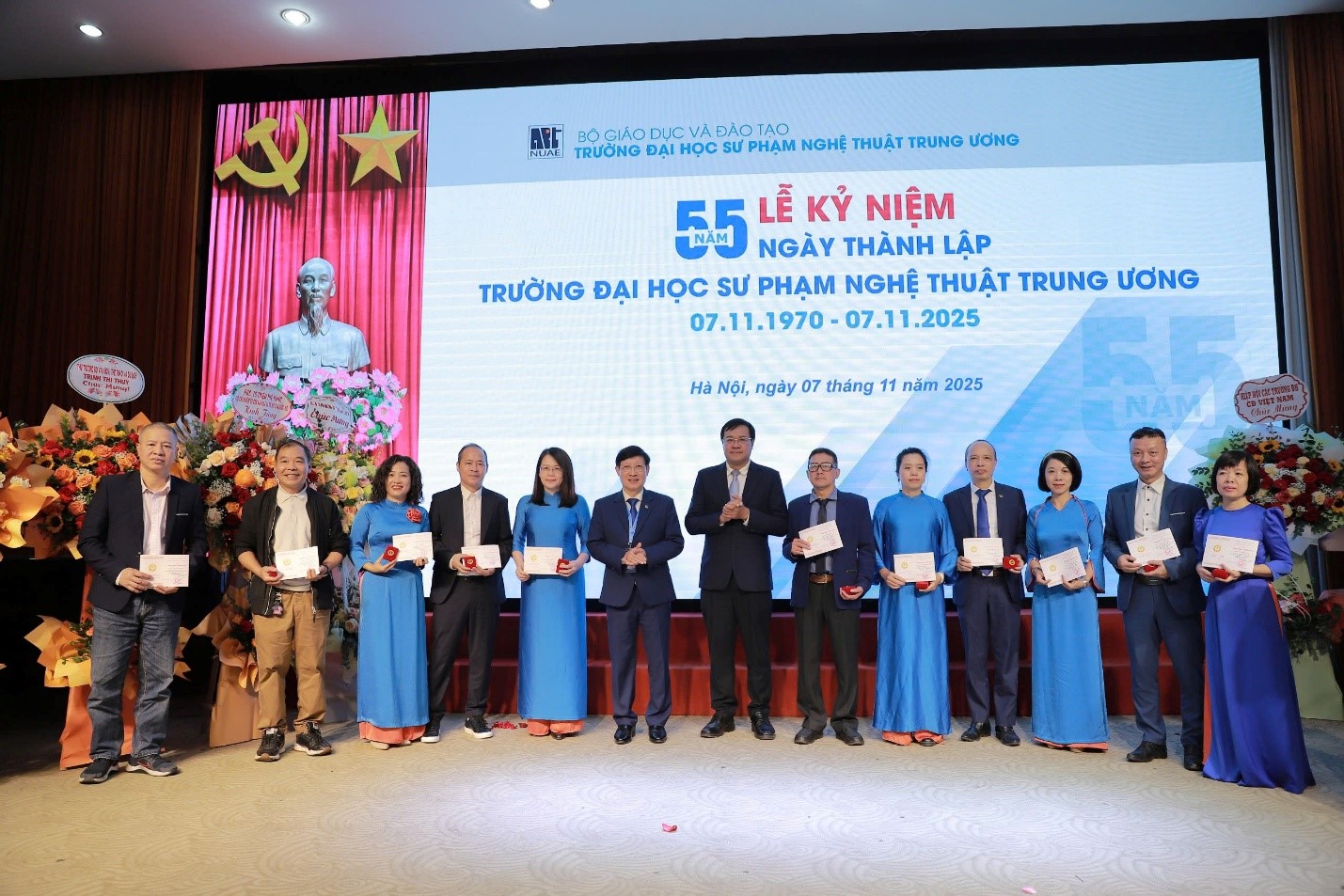 Sáng nay 07/11, Trường ĐHSP Nghệ thuật TW đã long trọng tổ chức Lễ kỷ niệm 55 năm ngày truyền thống (07/11/1970 – 07/11/2025). Buổi lễ là dịp để các thế hệ cán bộ, giảng viên, học viên, sinh viên ôn lại chặng đường 55 năm xây dựng và phát triển, tri ân những đóng góp to lớn của các thế hệ nhà giáo, đồng thời khẳng định vị thế và vai trò tiên phong của Nhà trường trong sự nghiệp đào tạo giáo viên và phát triển giáo dục nghệ thuật nước nhà.