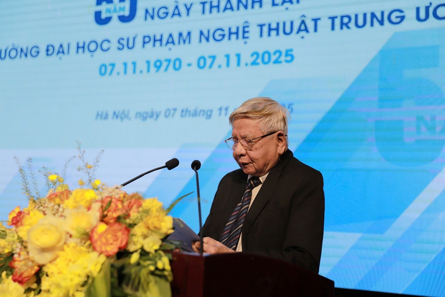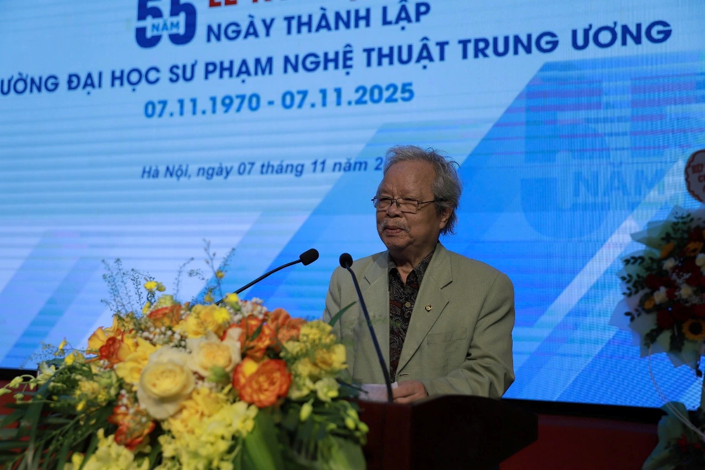 Tại buổi lễ, ông Trần Xuân Nhĩ – Nguyên Thứ trưởng Bộ Giáo dục và Đào tạo, Phó Chủ tịch Thường trực Hiệp hội các trường đại học, cao đẳng Việt Nam – bày tỏ niềm xúc động và vinh dự khi được tham dự Lễ kỷ niệm 55 năm thành lập Trường Đại học Sư phạm Nghệ thuật Trung ương. Ông nhấn mạnh, đây là ngôi trường mang trong mình sứ mệnh đặc biệt – đào tạo những người gieo hạt cho cái đẹp, cái thiện, cái chân trong tâm hồn con người Việt Nam. Ba lĩnh vực thể dục, âm nhạc và mỹ thuật chính là ba cánh cửa mở ra thế giới của sức khỏe, cảm xúc và sáng tạo. Từ nền tảng đó, biết bao thế hệ nhà giáo của trường đã tỏa đi khắp mọi miền Tổ quốc, mang theo ánh sáng nghệ thuật và tình yêu thương, góp phần làm phong phú đời sống học đường. PGS.TS. Trần Xuân Nhĩ gửi lời chúc Trường ĐHSP Nghệ thuật TW tiếp tục phát huy truyền thống tốt đẹp, xứng đáng là ngọn đuốc tiên phong trong sự nghiệp trồng người bằng nghệ thuật, vì mục tiêu xây dựng con người Việt Nam phát triển toàn diện.