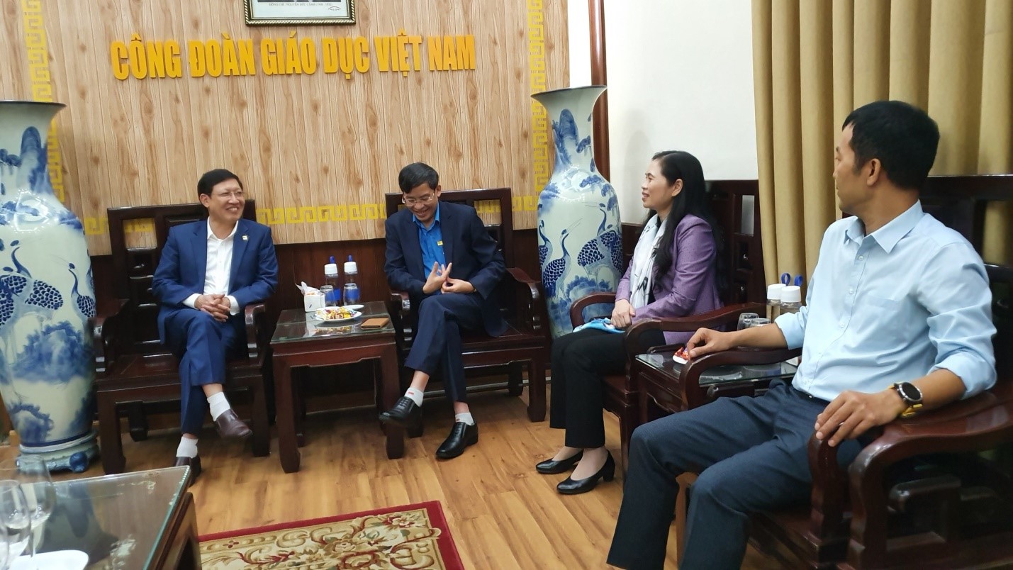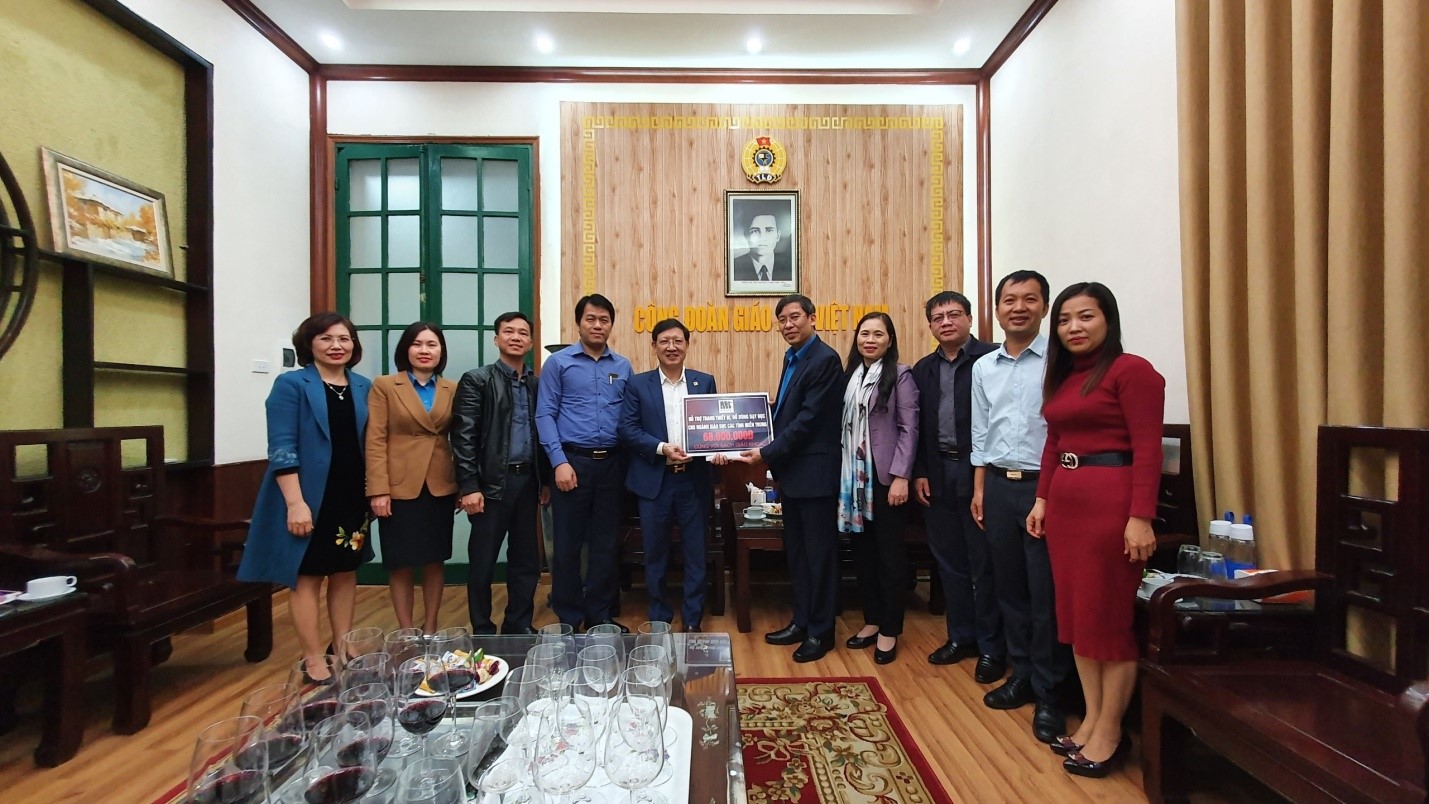 Đồng chí Vũ Minh Đức – Chủ tịch Công đoàn Giáo dục Việt Nam tiếp nhận số tiền ủng hộ từ đại diện lãnh đạo Nhà trường