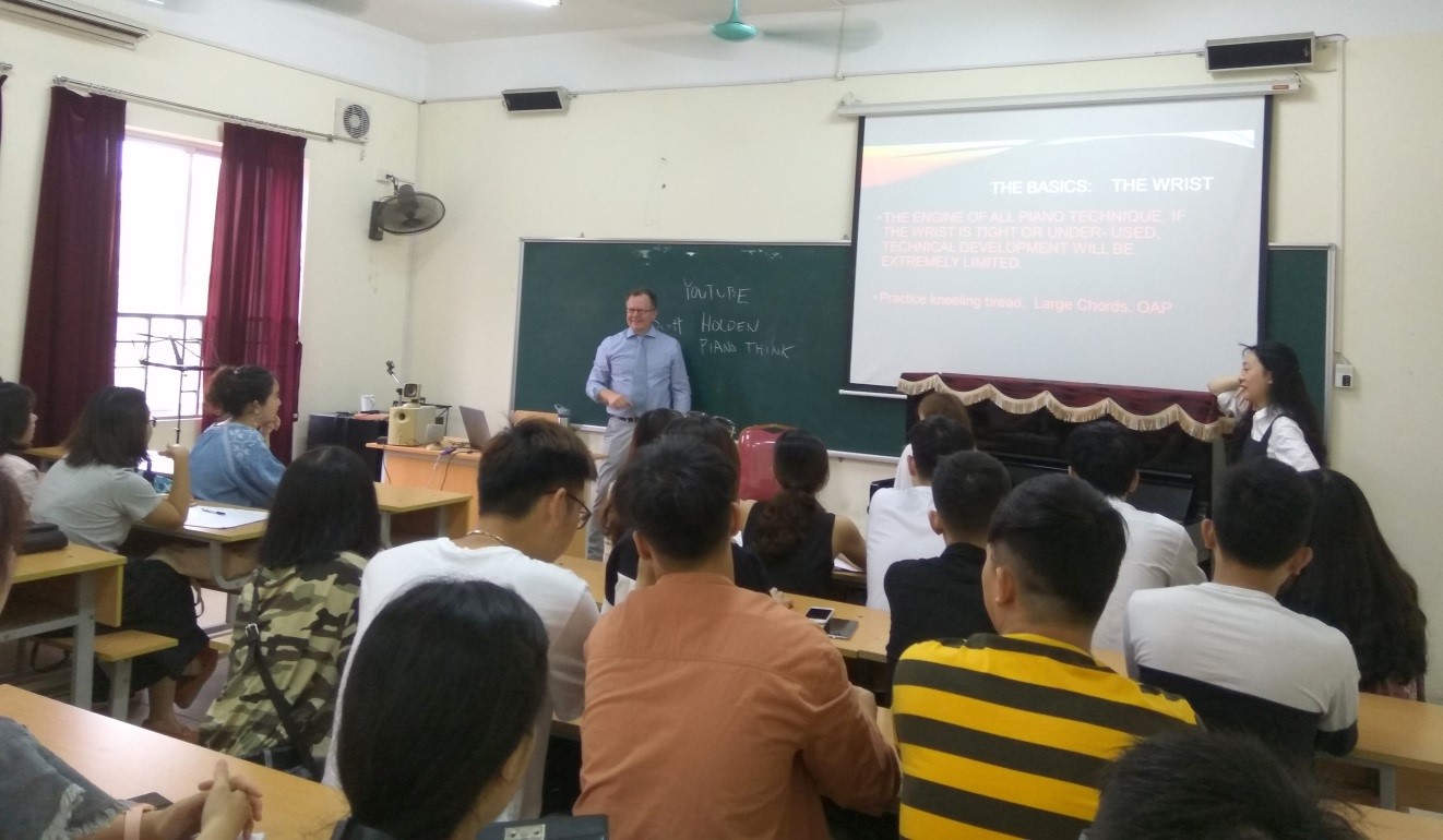 Kết thúc buổi làm việc với Ban Giám hiệu nhà trường, TS Scott Holden đã có một số bài giảng chuyên ngành cho sinh viên khoa Piano về một số phương pháp phát triển, kỹ thuật piano, sư phạm piano như kỹ thuật chơi một bài piano, cấu tạo của một bản Sonata, phương pháp luyện tập piano một cách hiệu quả… Đặc biệt trong chiều ngày 09/5/2019 TS. Scott Holden đã biểu diễn một số tác phẩm piano nổi tiếng trên thế giới tại phòng hòa nhạc. Đây thực sự là cơ hội trau dồi và trao đổi học thuật quý báu cho giảng viên, sinh viên, học viên nhà trường đặc biệt trong bối cảnh hợp tác và công bố quốc tế hiện nay đang được xã hội quan tâm, với đòi hỏi nâng cao chất lượng và hội nhập quốc tế.
