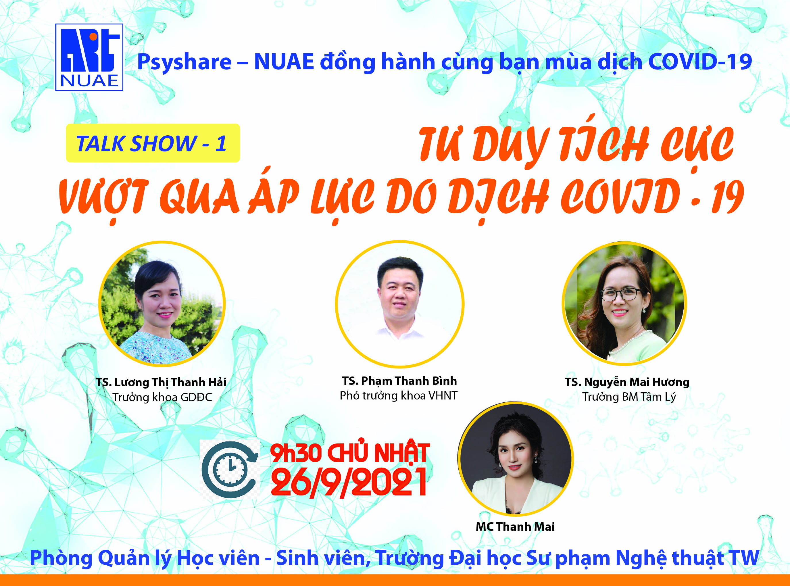 NUAE – Nằm trong chuỗi chương trình trực tuyến chăm sóc sức khoẻ tinh thần “Psyshare – NUAE đồng hành cùng bạn mùa dịch COVID-19” do Trường ĐHSP Nghệ thuật TW tổ chức, sáng ngày 26.9, số đầu tiên với chủ đề “Tư duy tích cực – vượt qua áp lực do dịch Covid” đã được phát trực tiếp trên fanpage Nhà trường.