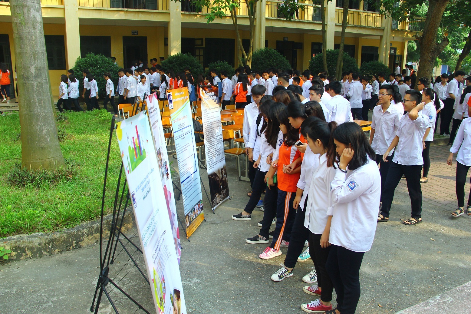 Các em học sinh chăm chú theo dõi standy giới thiệu các ngành học tại