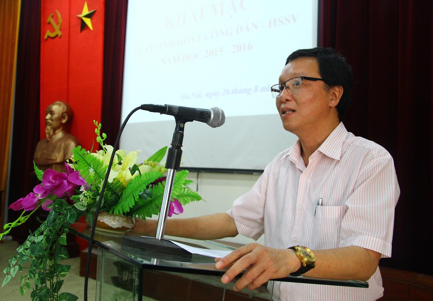 Phát biểu tại lễ khai mạc Tuần sinh hoạt công dân Học sinh, Sinh viên, TS. Trần Đình Tuấn – Phó hiệu trưởng Nhà trường chúc mừng các tân sinh viên đã trúng tuyển trong kỳ thi tuyển sinh năm 2015. Đồng thời, TS. Trần Đình Tuấn cũng giới thiệu tới các tân sinh viên về tình hình phát triển của Nhà trường trong thời gian qua và định hướng phát triển trong những năm tiếp theo. Mặt khác, Thầy Phó hiệu trưởng cũng hy vọng rằng qua tuần sinh hoạt này, các tân sinh viên sẽ được trang bị những kiến thức cơ bản và cần thiết để các em nhanh chóng hòa nhập với môi trường học tập mới; bước vào năm học 2015 – 2016 với tinh thần phấn khởi, tự tin và hoàn thành xuất sắc nhiệm vụ năm học.