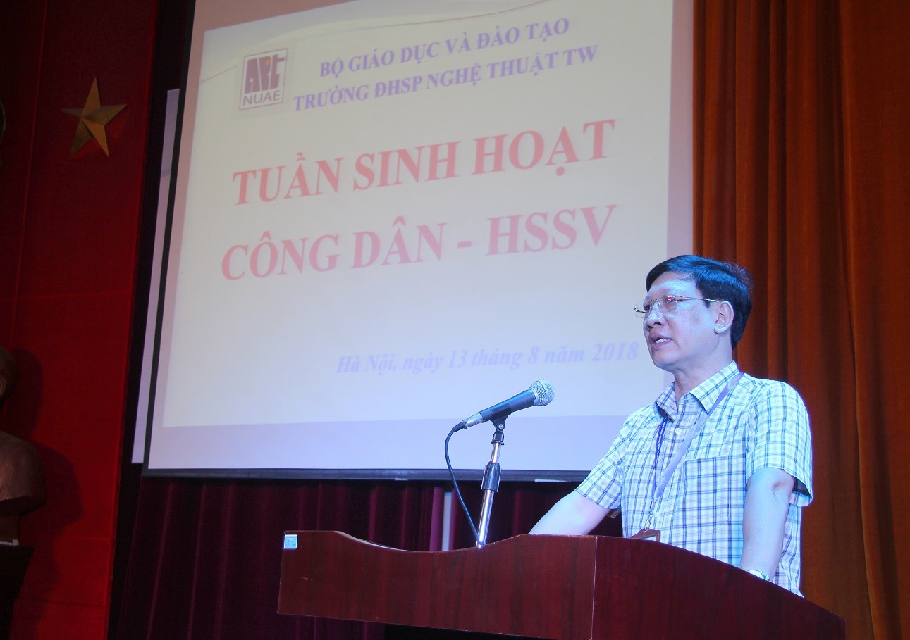 Phát biểu khai mạc Tuần sinh hoạt công dân HSSV, PGS.TS. Đào Đăng Phượng – Bí thư Đảng ủy, Hiệu trưởng Nhà trường chúc mừng các tân sinh viên đã trúng tuyển trong kỳ thi tuyển sinh năm 2018. Đồng thời, PGS.TS. Đào Đăng Phượng cũng giới thiệu khái quát về cơ cấu tổ chức, tình hình phát triển của Nhà trường trong thời gian qua và định hướng phát triển trong những năm tiếp theo. Mặt khác, thầy Hiệu trưởng cũng hy vọng rằng qua tuần sinh hoạt này, các tân sinh viên sẽ được trang bị những kiến thức cơ bản và cần thiết để nhanh chóng hòa nhập vào ngôi nhà chung Trường ĐHSP Nghệ thuật TW; bước vào năm học mới với tinh thần phấn khởi, tự tin và hoàn thành xuất sắc nhiệm vụ năm học.