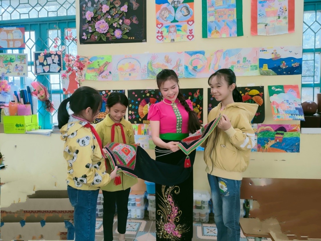 Tính mới của cách khai thác này là học sinh được trải nghiệm vẻ đẹp tạo hình và giá trị văn hóa của hoa văn trên trang phục đồng bào Thái của địa phương.