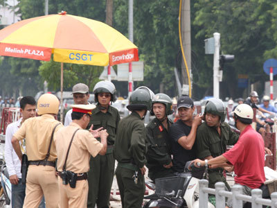 Cảnh sát hình sự hóa trang (áo xanh) tiến hành kiểm tra dưới sự hỗ trợ của CSGT.